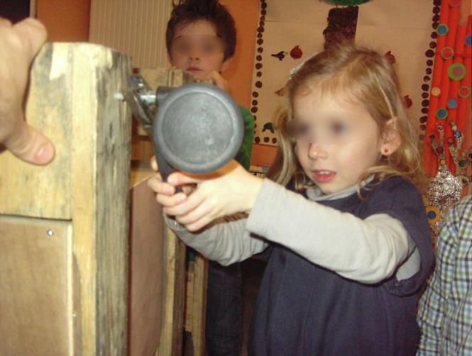 Capucine essaie à l'aide d'une pince de visser la roulette. Vocabulaire appris : roulette, pince, visser, vis, tournevis... |