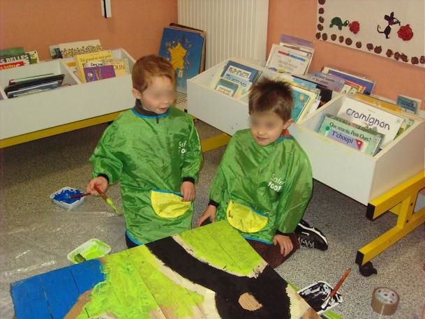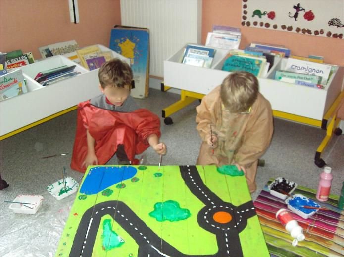 Alexandre et Eliott commencent par peindre les routes et le rond-point. Tom et Paul finissent de peindre la verdure. Les élèves ont choisi eux-mêmes les couleurs. |