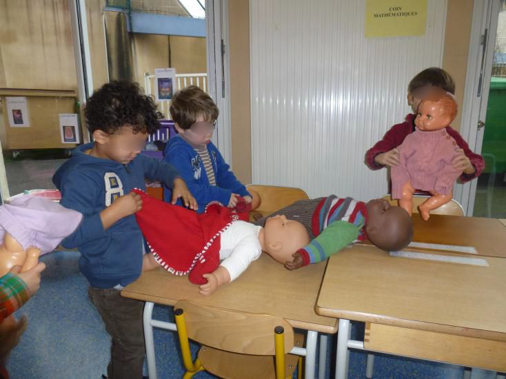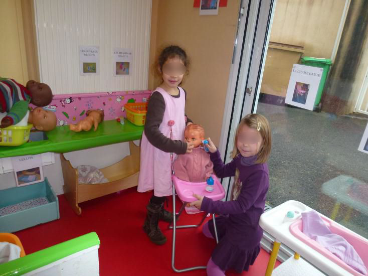 La maîtresse a peaufiné le tout et investi dans du nouveau matériel... Des poupées de différentes tailles, de différentes couleurs, de différentes matières, des barquettes de couleurs différentes pour ranger, trier. J'ai cherché des vêtements de bébé dans mes cartons, aussi variés que possible avec des matières différentes, des fermetures différentes... J'ai récupéré quelques jouets : miroir, outils de médecin, pot de toilette, accessoires de toilettes, baignoire... |