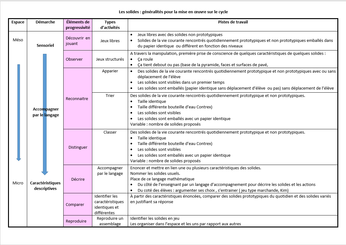 Ce tableau décline les éléments de progressivité pour l'enseignement des solides tout au long du cycle 1. Il propose également une démarche adaptée à l'apprentissage en commençant par les sens puis en dégageant les propriétes des solides.