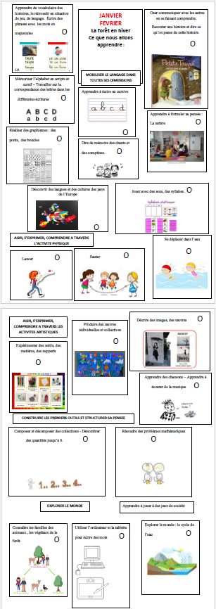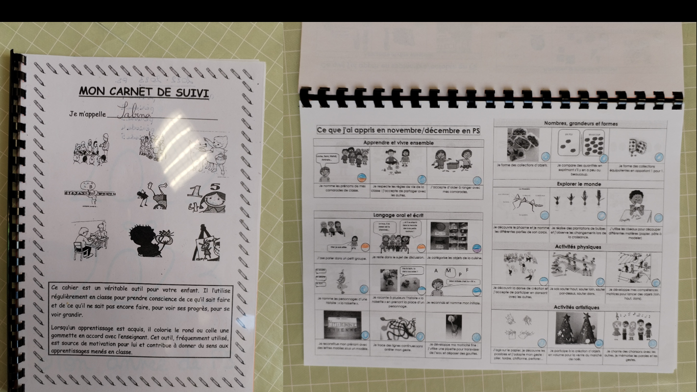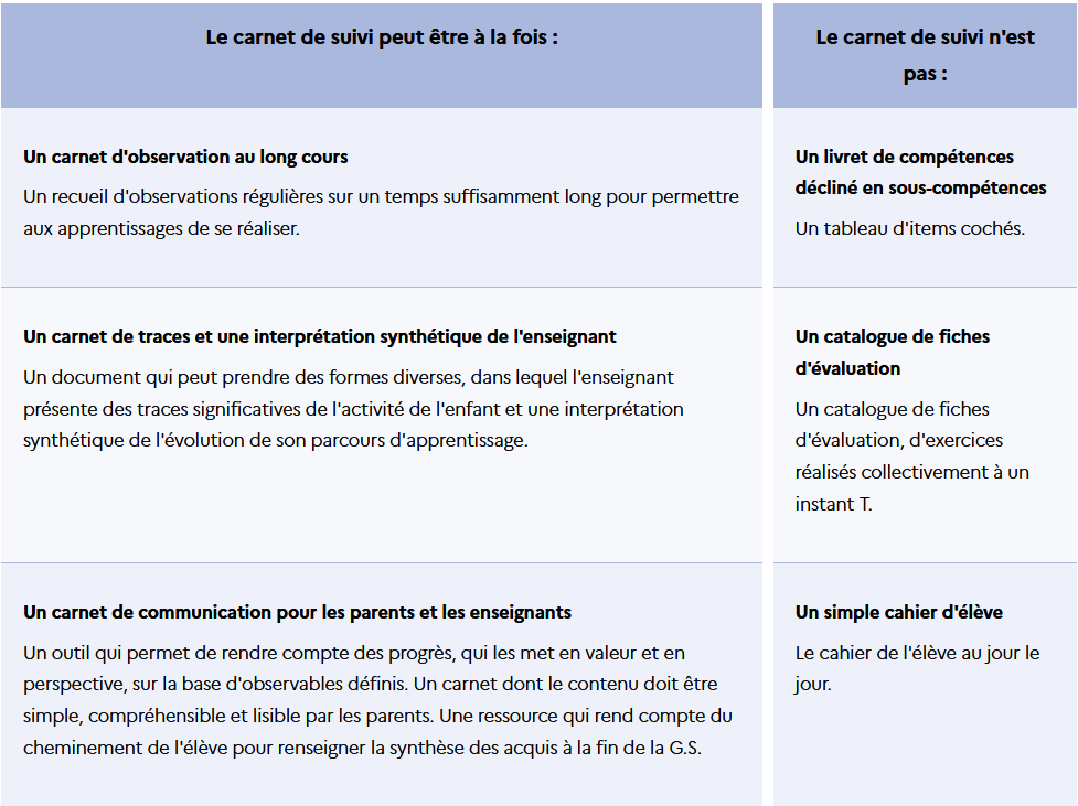 | À l'école maternelle, deux outils permettent d'assurer le suivi des apprentissages et des progrès des élèves : le carnet de suivi des apprentissages (renseigné tout au long du cycle) et la synthèse des acquis de l'élève (établie à la fin de la dernière année du cycle 1). Le carnet de suivi des apprentissages est communiqué aux parents ou au responsable légal de l'élève selon une fréquence adaptée à l'âge de l'enfant. Ressource Éduscol |