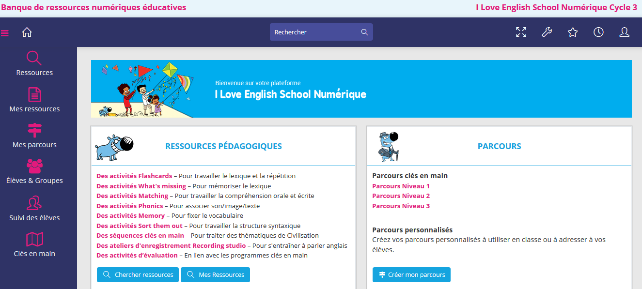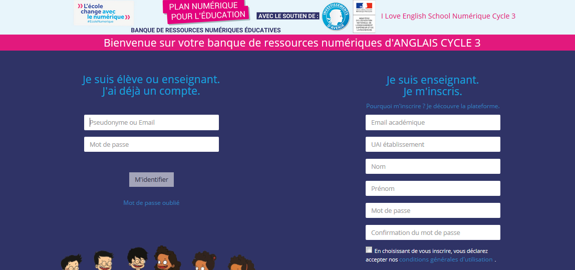 Nous vous présentons ici "I love English School Numérique",à destination des élèves du cycle 3. Cette ressource est mise à disposition des enseignants via la BRNE dans le cadre du plan numérique pour l'École et de la mise en œuvre de la réforme des programmes.