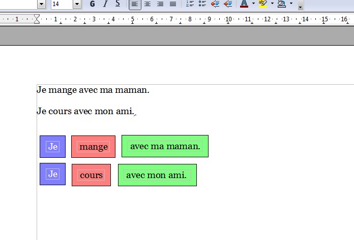 Cette partie de la barre d'outil permet de confectionner des étiquettes déplaçables à partir de mots ou de syllabes. Il faut d'abord taper le texte, sélectionner le texte choisi, cliquer sur un des boutons colorés et une étiquette est créer (exemple ci-après).