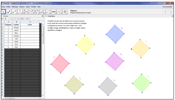 Cet outil permet à l’élève de manipuler, de rendre visible des propriétés géométriques, de changer le point de vue de l’objet ou des propriétés. Il offre des possibilités de visualisation qui ne sont pas réalisables avec un papier, un crayon et des outils de construction traditionnels, ni même au tableau. En ce sens, cet outil numérique (ordinateur, tablette, VPI) permet une géométrie dynamique et ludique; mais surtout amène l’élève à essayer de raisonner plus directement sur les propriétés des objets au-delà d’une simple perception.