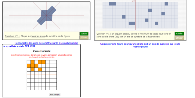 - de compléter des figures pour qu’une droite soit axe de symétrie, comme le site Matoumatheux ou le site Mathenpoche,