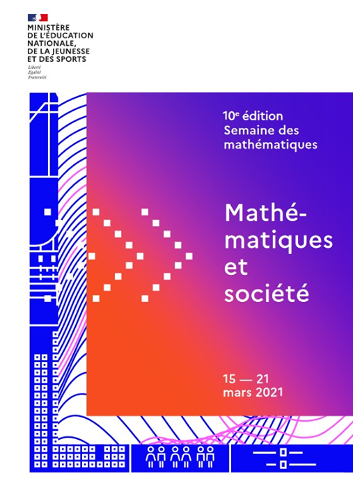 La dixième édition de la Semaine des mathématiques aura lieu du lundi 15 au vendredi 21 mars 2021, sur le thème « Mathématiques et société». Vous trouverez le livret de présentation et des pistes ici .