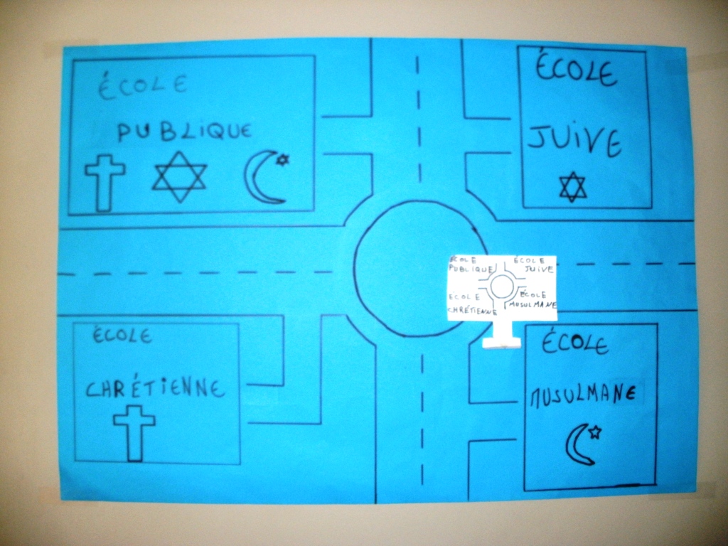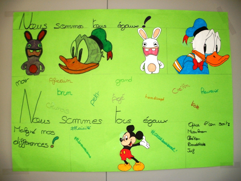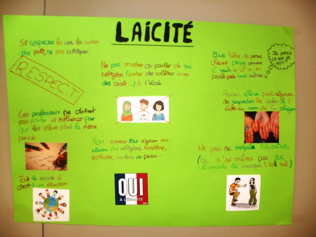 => 1er temps : De mi-octobre à début janvier, organisés en groupes de 2 ou 3, les élèves devaient créer des affiches sur la laïcité, sous la forme de leurs choix : mots croisés, mots mêlés, Bande Dessinée...