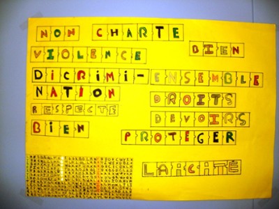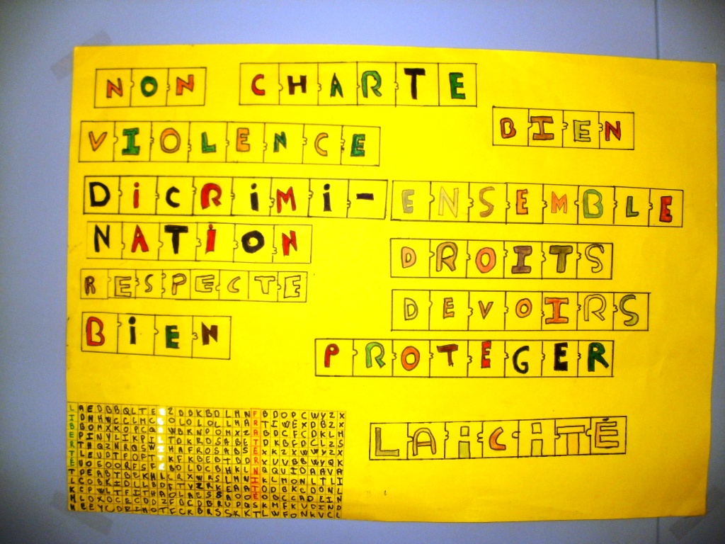 => 2ème temps : Durant la période de septembre jusqu'à la troisième semaine suivant les vacances d'octobre, chaque article de la Charte a donc été analysé (entre 1 et 2 articles analysés par séance). Ces analyses se faisaient sous forme de débats : tout le monde prenait la parole, chacun à son tour, expliquait ce qu'il comprenait, puis des débats collectifs s’enclenchaient. Tous les échanges étaient ludiques et intéressants.
