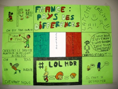 => 5ème temps : Les affiches créées par les élèves sont exposées en salle de permanence afin que tous puissent profiter de leurs productions mais aussi pour faire réfléchir certains élèves quand leur comportement en étude pose des problèmes relatifs aux questions de la laïcité.