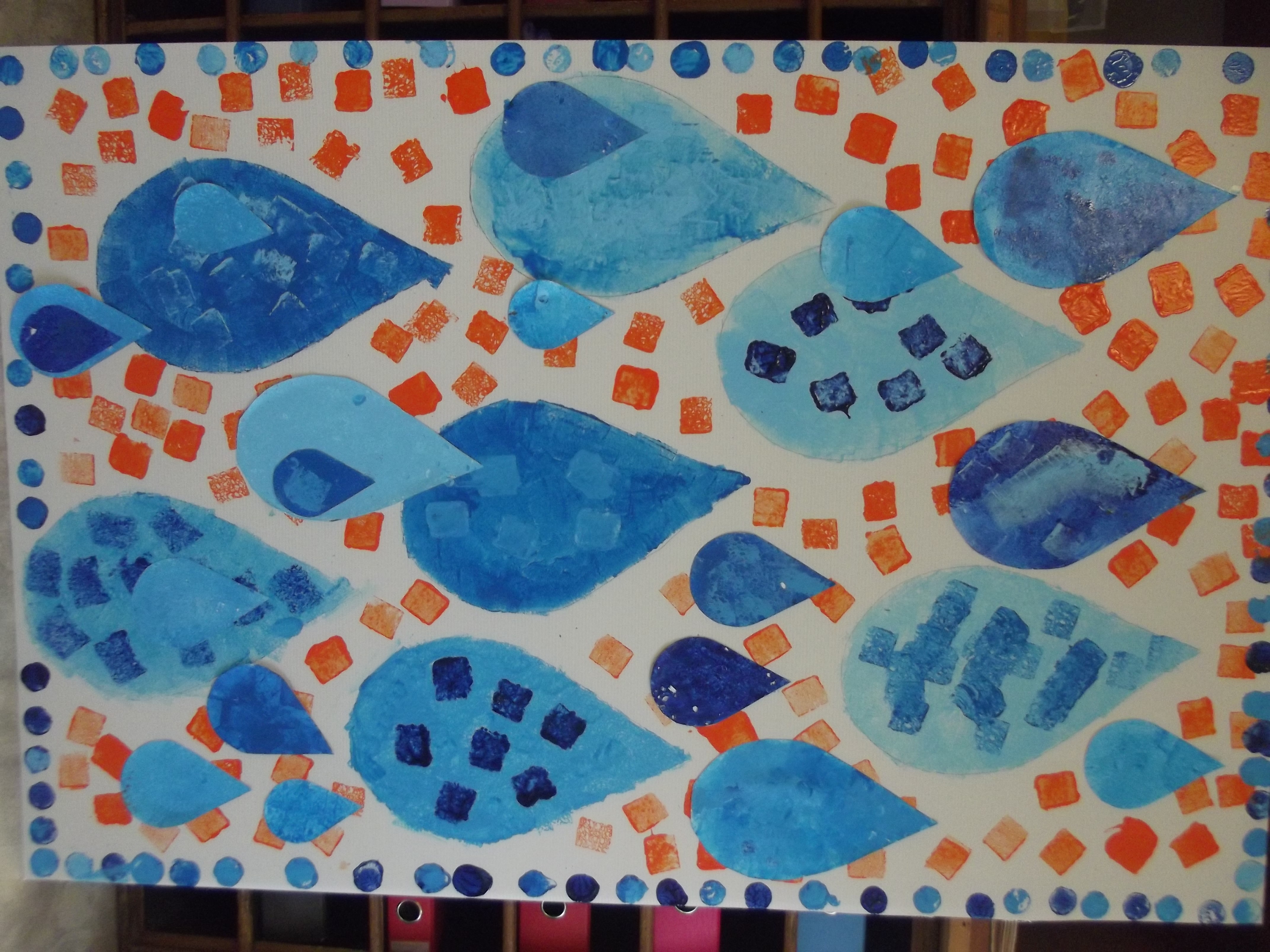 - traduire l’eau par des traces colorées, des coulures sur des supports aux formes variées (rond, ovale…).