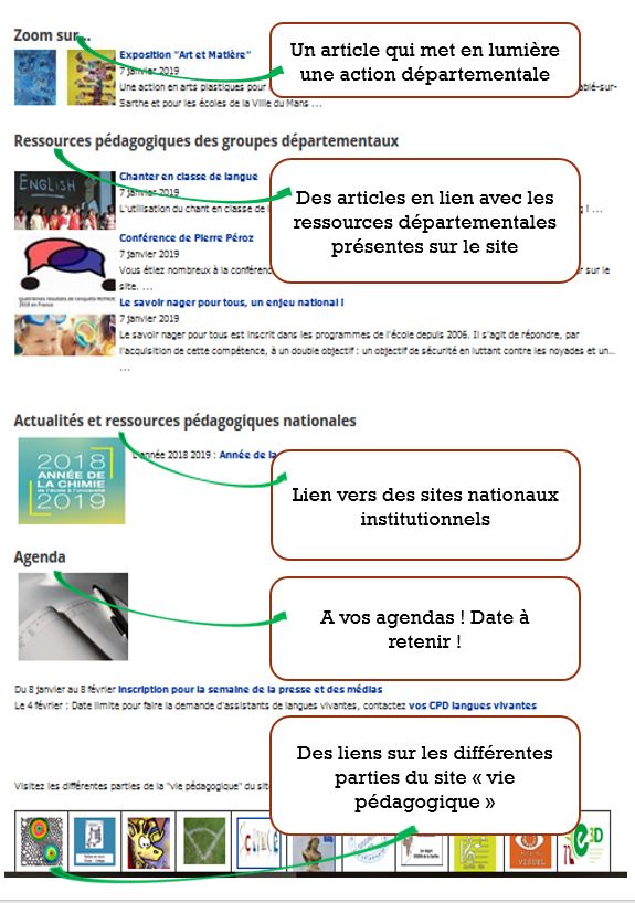 (Zoom sur : Arts plastiques l'exposition les 5 sens, Ressources pédagogiques : la carte interactive sur le patrimoine local en Sarthe,le plan d'action départementale EPS )