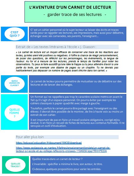La note de service n° 2018-049 du 25-4-2018 explique pourquoi et comment construire le parcours du lecteur autonome. L'aventure de garder traces de ses lectures est une des pistes permettant aux élèves de devenir "sujet lecteur".Voici quelques pistes pour les accompagner les élèves dans la tenue d'un carnet de lecteur...