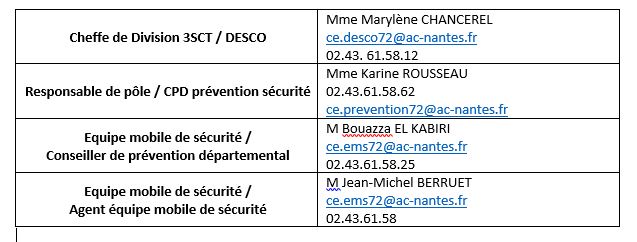 Depuis septembre 2017, la DSDEN de la Sarthe dispose d'un pôle 3SCT : sécurité, sûreté, santé et conditions de travail.