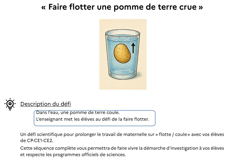 Dans le cadre des animations pédagogiques, 60 enseignantes et enseignants ont bénéficié d'une formation à la réalisation de ces défis scientifiques. Pour autant, les ressources sont accessibles pour tous ! Il n’est pas nécessaire d’avoir reçu la formation pour mettre en œuvre les défis dans sa classe. Si vous souhaitez être accompagné en classe, n’hésitez pas à nous contacter à l’adresse suivante cpd85.sciences@ac-nantes.fr