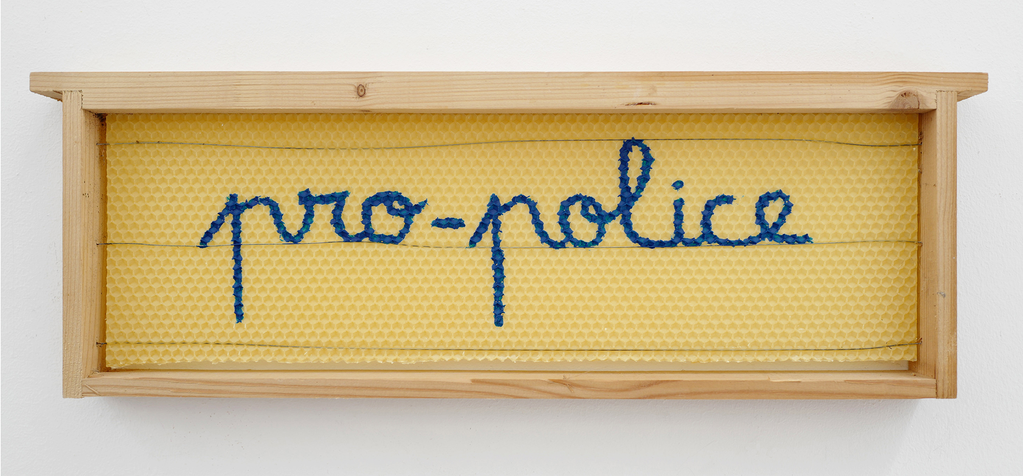 Triptyque constitué de trois cadres de ruche dans lesquels sont écrits à même la cire, et un peu à la manière de Ben, des jeux de mots, plus ou moins acides, relatifs au monde des abeilles : apiculture, pollen et propolis.