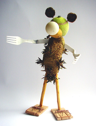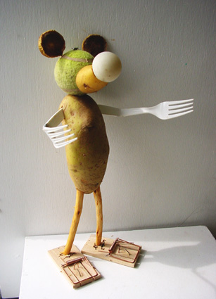 Autrefois les artistes représentaient à travers leurs sculptures des hommes ou des dieux à formes humaines. Une souris, à la forme humaine, nommée Mickey a rythmé notre enfance et notre adolescence dans des dessins animés à tendance humoristique Représenter Mickey par un assemblage de matériaux utilisés tous les jours, c'est pour moi un clin d'oil à mon enfance qui s'enfuie comme la pomme de terre qui doucement se détériore et quelques objets qui restent comme si la sculpture était intemporelle. C'est pour moi ma perception de l'art moderne. Les tapettes à souris ajoutent un côté humoristique comme si elles avaient attrapé mickey sans jamais le relâcher . caroline professeur, Vincent Chudeau - collège Saint-Louis à Saumur |