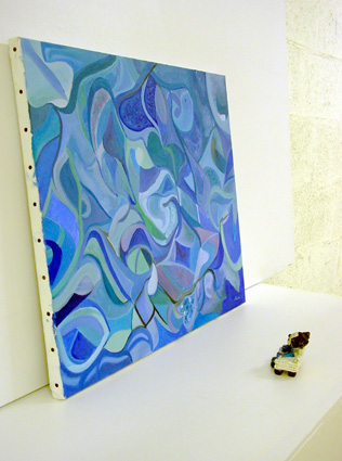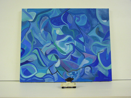marine - 3e tableau abstrait de grande dimension et figurine de Mickey en pâte à sel peinte avec une dominante bleue