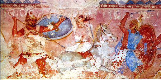 Ci-dessus, détail d'une peinture ornant un sarcophage de Tarquinia et représentant le combat des Amazones