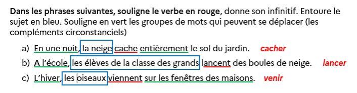 Après chaque phrase, le verbe est écrit à l'infinitif en rouge.