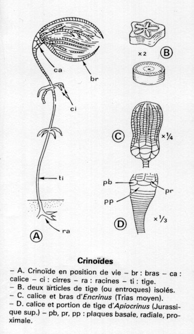 Crinoïdes n. m. pl. (du grec krinon, lis et eidos, forme) - groupe d'Echinodermes composés typiquement d'un calice (ou thèque) régulier à symétrie axiale d'ordre 5 portant des bras et d'une tige assurant la fixation de l'animal. Cette dernière peut manquer lorsque l'animal est fixé directement par son calice ou lorsqu'il mène une vie pélagique.