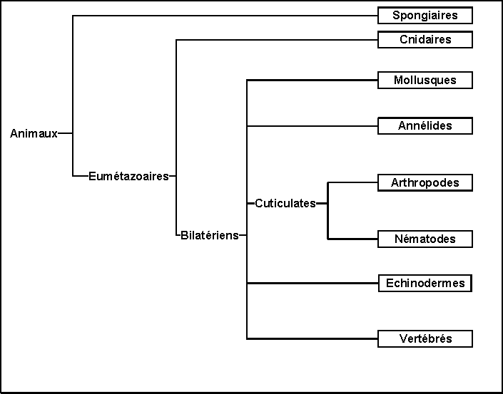 Gamètes produits directement par des glandes sexuelles Corps segmenté en anneaux Symétrie bilatérale du corps, Vertèbres, système nerveux dorsal, crâne entourant l'avant du système nerveux Corps limité par une cuticule Symétrie pentaradiée pendant une partie de la vie, pieds ambulacraires sortant à l'extérieur vers rond, non segmenté Corps segmenté, carapace articulée, appendices pairs articulés, croissance par mue. Embryons composés de plusieurs tissus très spécialisés Présence de cellules urticantes : les cnidocytes. Squelette formé de spicules siliceux ou calcaires Manteau secrétant du calcaire LES ANIMAUX |