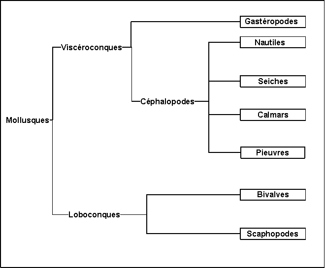coquille, Coquille absente, 8 tentacules. Coquille réduite à une "plume" chitineuse. Coquille légère et calcaire (os de seiche). Couronne de tentacules entourant une bouche pourvue de deux mandibules, Tête bien développée avec des organes sensoriels