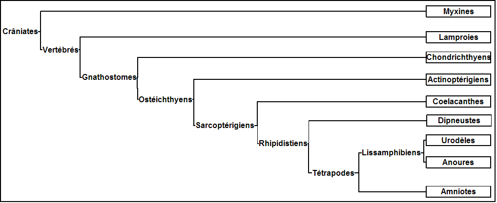 inférieures bilatérales, Branchies soutenues par un squelette spécial Vertébres Cartilage du squelette entouré d'une couche de cartilage prismatique Langue en forme de piston Respiration par des branchies ou des poumons suivant l'oxygénation de l'eau LES CRÂNIATES |
