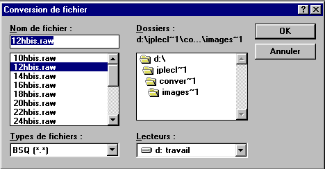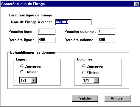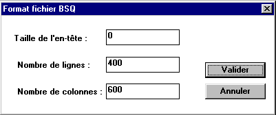 En validant l'option "OK", Titus demande alors le nombre de lignes et de colonnes, il faut alors entrer les valeurs des nombres de lignes et de colonnes données précédemment par Paintshop, cette condition est absolument nécessaire pour que l'image soit correctement traitée ; il suffit alors de donner un nom explicite à l'image.Conversion d'un fichier "RAW" en fichier "BSQ"