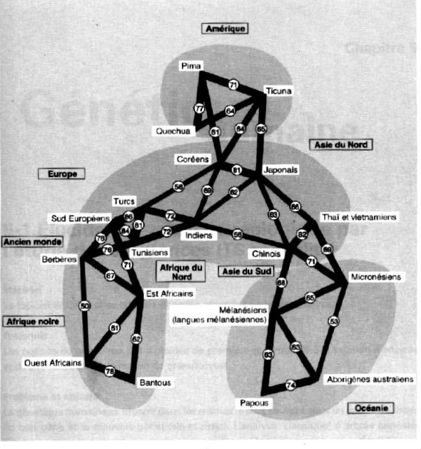 La comparaison du réseau génétique concernant le « gène Rhésus » (activité 5) et du réseau génétique dressé par le Laboratoire de génétique et biométrie de Genève permet de dégager les faits essentiels qui régissent les relations génétiques entre les populations. Ces faits essentiels sont les hypothèses que vous avez formulées dans l'activité 4.