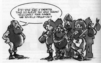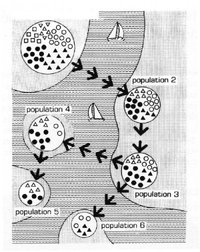 Dans ce schéma issu de « les Hommes, passé, présent, conditionnel », les migrants traversent des bras de mer. Les déserts, les montagnes ou tout simplement la distance font aussi bien l'affaire. Au reste, rien de cela n'est infranchissable pour les Hommes et leurs allèles car il existe toujours des échanges génétiques entre les populations. Il ne faut pas imaginer non plus que les fréquences alléliques des populations issues des migrants demeurent fixes au cours du temps car la dérive génétique affecte particulièrement les populations de petite taille.