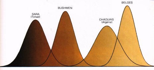Représentation schématique de la variabilité de la réflectance dans diverses populations. Il est à noter que l'abondance d'un seul pigment est responsable de toutes les nuances rencontrées parmi les Hommes modernes.