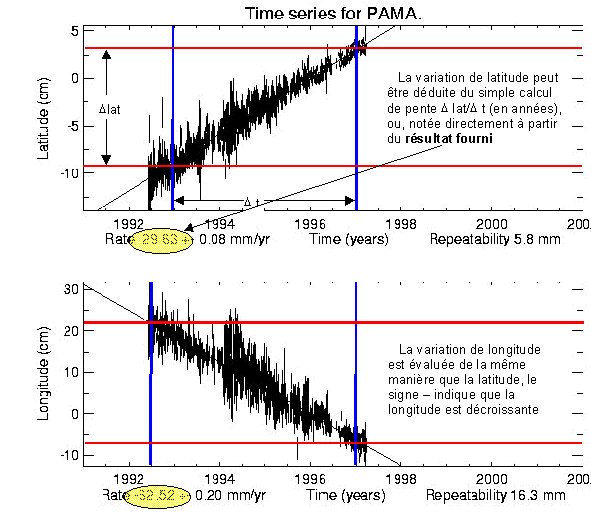 Le fichier "liste" s'obtient toujours sur le site précédent en validant le lien "Geodetic Positions and Velocities" , on obtient alors la liste des stations avec notamment leurs coordonnées ainsi que les vitesses de déplacement en latitude et en longitude; c'est à partir de cette liste que sera effectué le tableau de données.
