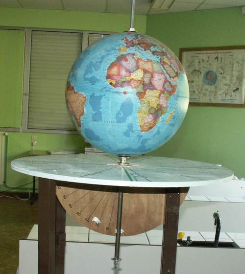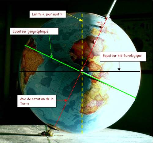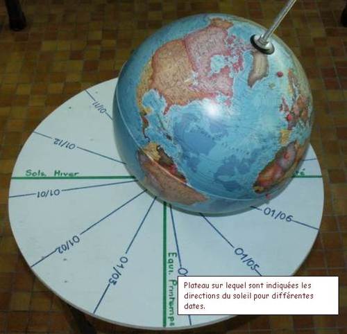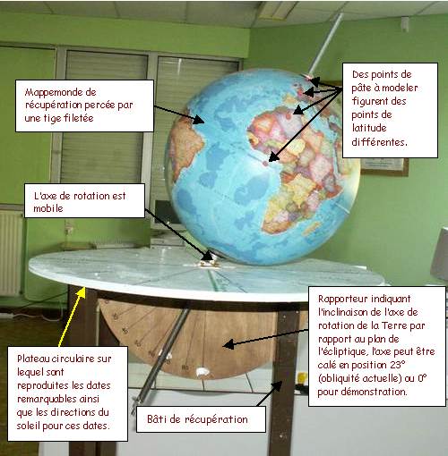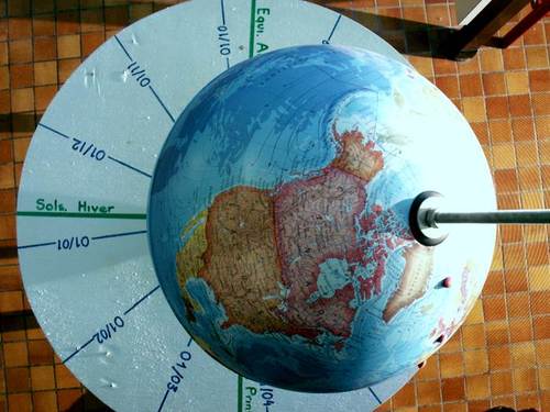 Le montage proposé se compose d'un globe récupéré sur une mappemonde percé par une tige filetée, le globe peut tourner autour de son axe. Dans cette position, la Terre est inclinée de 23°27' par rapport au plan de l'écliptique (obliquité de 23°27'), on observera alors, pour différentes dates, les déclinaisons solaires actuelles. |