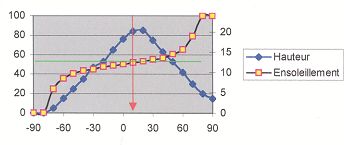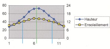 Hauteur du soleil et durée de l'ensoleillement pour une latitude de 45°N, les équinoxes (durée du jour égales à 12h) marquent la fin de l'hiver et de l'été, le solstice d'été (durée du jour maximale) marque le début de l'été; à 45°N de latitude le soleil à midi fait un angle de 72° avec l'horizon.