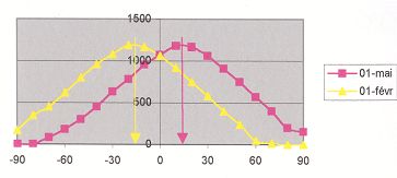 L'exemple ci dessus représente les variations de l'énergie captée au sol en fonction de la latitude pour le premier mai et le premier février. Pour le 1er février, l'énergie captée au sol est maximale à la latitude 15°S, tandis qu'elle est maximale à la latitude 13°N le 1er mai.