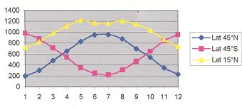 L'exemple ci-dessus représente les variations annuelles de l'énergie captée au sol pour des lieux de latitude 45°N, 45°S et 15°N.