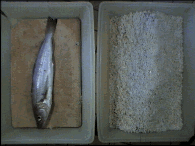 Le but de l’expérience est de démontrer que le sel a une action sur le poisson que l’on a recouvert. Pour ce faire, on laisse les 2 poissons à l’air libre pendant une semaine, sans y toucher.