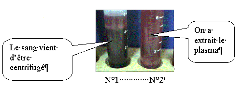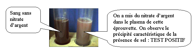 Lexpérience consistait à prouver la présence de sel dans le sang. Sachant que le nitrate dargent ( Ag NO3 ) montre par un précipité sil y a du sel, on a utilisé ce produit comme réactif. Seul le plasma sanguin nous intéressait nous avons donc centrifuger du sang pour obtenir ce liquide. On a fait ensuite le TEST AU NITRATE DARGENT. Un précipité blanc ( Ag Cl ) virant au noir au soleil est alors apparu témoignant de la présence de sel (fig. au dessus). Nous pouvons donc affirmer :