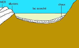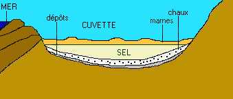 Les cristaux de sel apparus après évaporation de leau dun mer dans les temps géologiques anciens, auraient été recouverts de sédiments déposés lors de larrivée dune nouvelle mer. |
