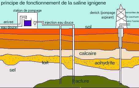 Cependant il existe encore dautres façons de récupérer ce sel gemme, lune d'elles consiste à, dans un premier temps, sonder des carottes de sel pour tester sa qualité. Puis on injecte de leau douce dans le trou formé par lextraction de la carotte. Leau traversant ainsi la couche de sel, le sel gemme se dissout en saumure qui est extrait à laide dune pompe aspirante. Cette saumure ainsi obtenu pourra être utilisé pour alimenter des marais salants (produisant le sel dit solaire) ou sera directement utilisé comme matière première pour lindustrie chimique et pharmaceutique. |
