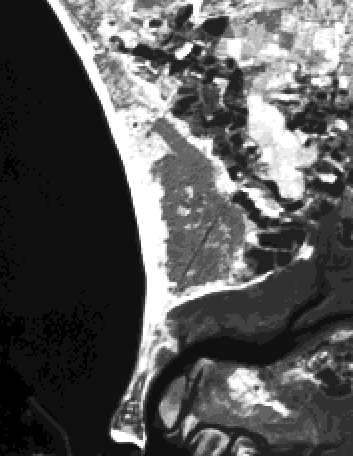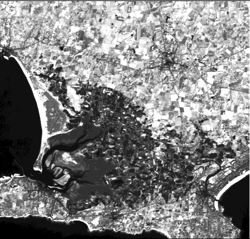 En utilisant le logiciel Titus, afficher le canal XS3 correspondant au proche infra rouge en 256 nuance de gris. Si certains types d'objets peuvent assez facilement être identifiés par leur teinte de gris (l'eau de la mer, le sable de la plage), il n'en est pas même pour les autres. |
