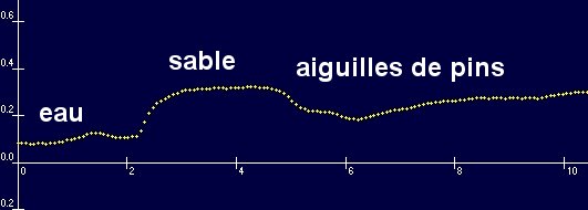 | Le logiciel d'acquisition est paramétré pour afficher la valeur de U (en Volts) en fonction de t (en secondes). Pendant l'acquisition, le paysage modèle est déplacé par rapport au radiomètre à une vitesse la plus régulière possible. La mécanisation du déplacement peut être envisagée. |