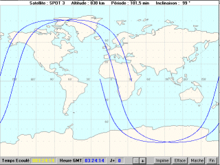 Les radiomètres étant montés sur un satellite "SPOT" à orbite polaire, la visualisation d'une orbite permet de se rendre compte que le paysage et ses différents objets défilent sous le satellite. Cette animation est disponible par "Démarrer" / "Programme" / "Images satellitales" puis "Orbito". On pourra ainsi ré-investir les acquis de physique sur les changements de référentiel. Dans le cas qui nous occupe, venant du sud, le satellite coupera la côte. De cette facon il "verra" successivement de l'eau, du sable, etc. |
