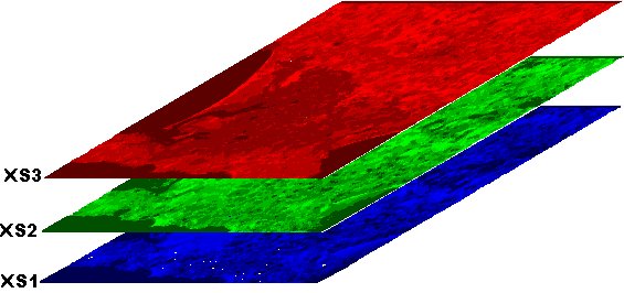 Il s'agit d'affecter de façon arbitraire une couleur à chaque canal en lieu et place des teintes de gris. Exemple : plus la valeur radiométrique est forte dans l'infrarouge (XS3) plus l'écran montre un rouge intense. On procède de même pour chacun des autres canaux. La couleur résultante est le mélange additif des trois teintes.