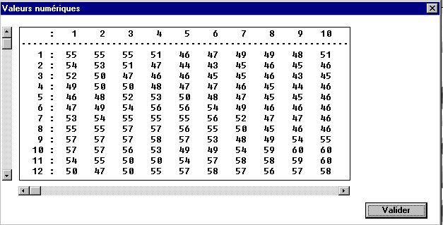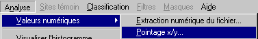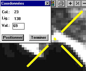 Cliquer sur "Positionner" puis sur le point à étudier. Les coordonnées du pixel et sa valeur radiométrique sont affichées dans la fenêtre. Par "Analyse"/ "Valeurs numériques" puis "Extraction numérique du fichier", il est possible de visualiser les valeurs numériques de tous les pixels. |