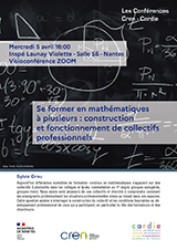 | Le 5 avril 2023 Se former en mathématiques à plusieurs : construction et fonctionnement de collectifs professionnels Sylvie Grau Le détail ici | |||