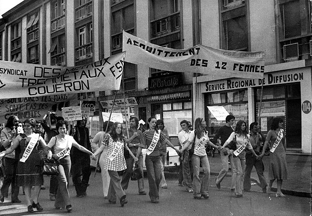 Image : Les douze femmes en tête du cortège suivies des ouvriers de Tréfimétaux se dirigeant, en manifestant, vers le Palais de Justice de Saint-Nazaire, Auteur : Usine7180 Date : 17 juin 1976 Licence : CC BY-SA 4.0