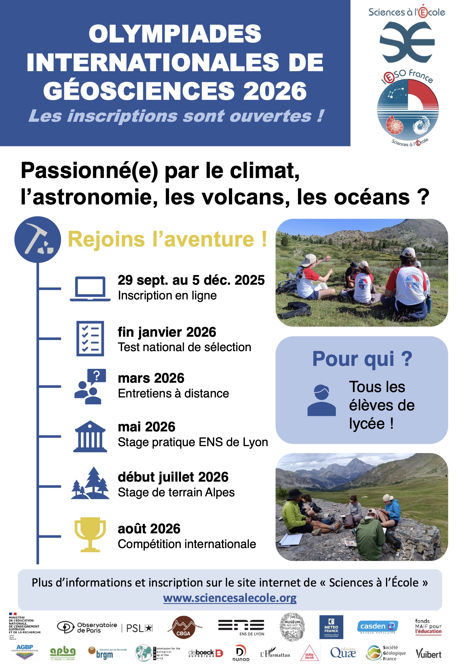 Tous les élèves de 1ère et Terminale, quelles que soient les spécialités choisies ; peuvent participer à cette préparation et avoir la possibilité de remporter les récompenses qui seront offertes par les partenaires. Pour pouvoir intégrer la délégation française et représenter la France aux prochaines Olympiades Internationales :